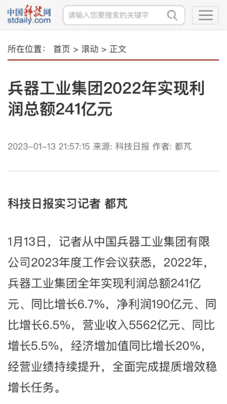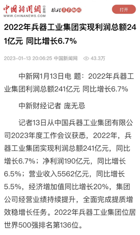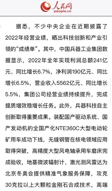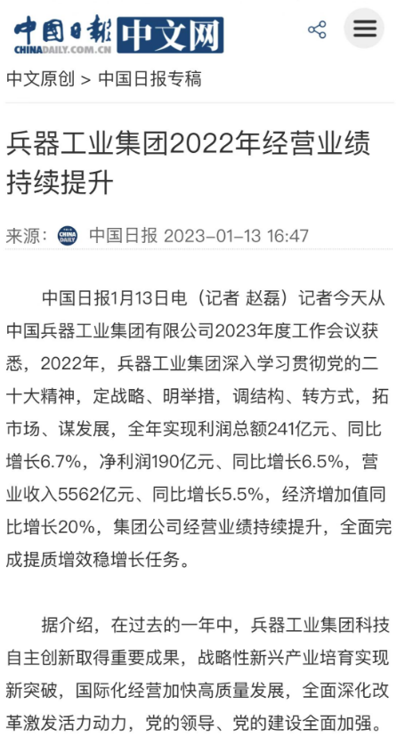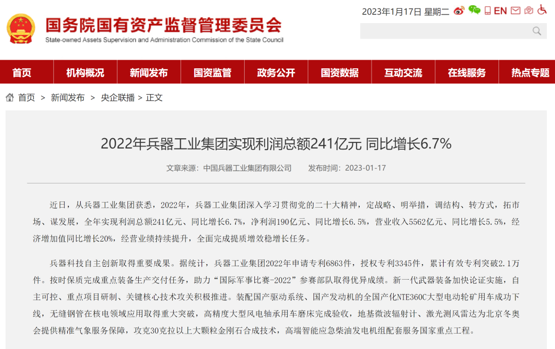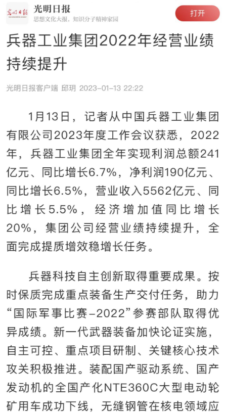1月13日,中國(guó)兵器工業(yè)集團(tuán)有限公司召開2023年度工作會(huì)議,傳達(dá)學(xué)習(xí)中央領(lǐng)導(dǎo)同志、軍方首長(zhǎng)和上級(jí)部門重要批示,總結(jié)集團(tuán)公司2022年工作,研究部署2023年主要工作任務(wù)。 集團(tuán)公司2022年重點(diǎn)工作取得的成績(jī)及下一步的改革發(fā)展受到社會(huì)媒體廣泛關(guān)注。新華社、新華財(cái)經(jīng)、人民網(wǎng)、經(jīng)濟(jì)日?qǐng)?bào)客戶端、光明日?qǐng)?bào)客戶端、中國(guó)日?qǐng)?bào)網(wǎng)、中國(guó)科技網(wǎng)、中國(guó)新聞網(wǎng)、央廣網(wǎng)、國(guó)資委網(wǎng)站、學(xué)習(xí)強(qiáng)國(guó)中央企業(yè)學(xué)習(xí)平臺(tái)、新浪網(wǎng)、騰訊網(wǎng)、搜狐網(wǎng)、網(wǎng)易網(wǎng)、今日頭條等中央主流媒體、國(guó)家部委網(wǎng)站及知名網(wǎng)絡(luò)媒體對(duì)集團(tuán)公司工作會(huì)議進(jìn)行了報(bào)道,重點(diǎn)關(guān)注集團(tuán)公司高質(zhì)量發(fā)展、科技創(chuàng)新、戰(zhàn)略性新興產(chǎn)業(yè)培育、深化改革、國(guó)際化經(jīng)營(yíng)、履行央企社會(huì)責(zé)任等內(nèi)容。其中新華社以《北斗時(shí)空智能服務(wù)平臺(tái)累計(jì)服務(wù)終端數(shù)突破15億》為題,重點(diǎn)報(bào)道了集團(tuán)公司2022年在自主創(chuàng)新、戰(zhàn)略新興產(chǎn)業(yè)培育、專利申請(qǐng)等方面取得的成績(jī);經(jīng)濟(jì)日?qǐng)?bào)客戶端、光明日?qǐng)?bào)客戶端、中國(guó)日?qǐng)?bào)網(wǎng)等以《兵器工業(yè)集團(tuán)2022年經(jīng)營(yíng)業(yè)績(jī)持續(xù)提升》為題,重點(diǎn)報(bào)道了集團(tuán)公司在高質(zhì)量發(fā)展、全面完成提質(zhì)增效穩(wěn)增長(zhǎng)方面取得的成績(jī)。集團(tuán)公司門戶網(wǎng)站、微信公眾號(hào)、微博等新媒體也對(duì)集團(tuán)公司工作會(huì)議進(jìn)行了及時(shí)報(bào)道,各成員單位紛紛對(duì)相關(guān)內(nèi)容進(jìn)行轉(zhuǎn)載,引發(fā)全系統(tǒng)關(guān)注。 新華社:北斗時(shí)空智能服務(wù)平臺(tái)累計(jì)服務(wù)終端數(shù)突破15億 新華財(cái)經(jīng):兵器工業(yè)集團(tuán)2022年實(shí)現(xiàn)凈利潤(rùn)190億元 同比增長(zhǎng)6.5% 人民網(wǎng):2022年中央企業(yè)營(yíng)收同比增長(zhǎng)8.3% 科技創(chuàng)新成效顯著 經(jīng)濟(jì)日?qǐng)?bào)客戶端:兵器工業(yè)集團(tuán)2022年經(jīng)營(yíng)業(yè)績(jī)持續(xù)提升 光明日?qǐng)?bào)客戶端:兵器工業(yè)集團(tuán)2022年經(jīng)營(yíng)業(yè)績(jī)持續(xù)提升 中國(guó)日?qǐng)?bào)網(wǎng):兵器工業(yè)集團(tuán)2022年經(jīng)營(yíng)業(yè)績(jī)持續(xù)提升 中國(guó)科技網(wǎng):兵器工業(yè)集團(tuán)2022年實(shí)現(xiàn)利潤(rùn)總額241億元 中國(guó)新聞網(wǎng):2022年兵器工業(yè)集團(tuán)實(shí)現(xiàn)利潤(rùn)總額241億元 同比增長(zhǎng)6.7% 國(guó)資委網(wǎng)站:2022年兵器工業(yè)集團(tuán)實(shí)現(xiàn)利潤(rùn)總額241億元 同比增長(zhǎng)6.7% 學(xué)習(xí)強(qiáng)國(guó)中央企業(yè)學(xué)習(xí)平臺(tái):兵器工業(yè)集團(tuán)2022年經(jīng)營(yíng)業(yè)績(jī)持續(xù)提升 集團(tuán)公司職工及廣大網(wǎng)友熱議工作會(huì)議 “這次會(huì)議全面總結(jié)了2022年工作,深入分析研判當(dāng)前形勢(shì),部署2023年重點(diǎn)工作,為我們做好2023年及今后一個(gè)時(shí)期的工作明確了目標(biāo)、堅(jiān)定了信心。” “作為兵工人,我要苦練內(nèi)功、不懼挑戰(zhàn)、奮勇向前,為建設(shè)具有全球競(jìng)爭(zhēng)力的世界一流集團(tuán)公司貢獻(xiàn)自己的力量?!?/p> “聚焦高科技領(lǐng)域,制造更多的大國(guó)重器,讓更多的產(chǎn)品服務(wù)老百姓。” “在不平凡的2022年取得了亮眼的工作成績(jī),為兵器工業(yè)點(diǎn)贊?!?/p> “希望能有更多新型武器裝備部隊(duì),2023年,望你們?cè)賱?chuàng)輝煌,加油!” |