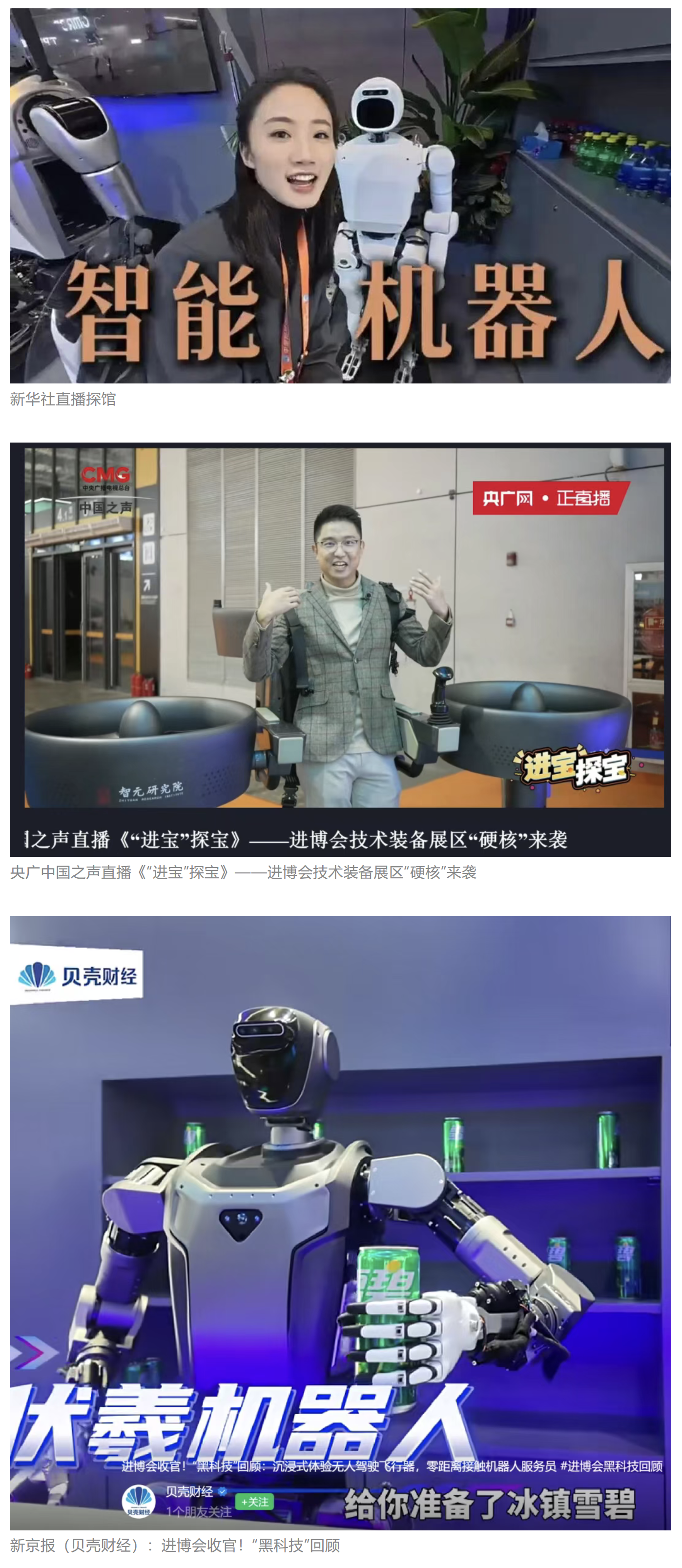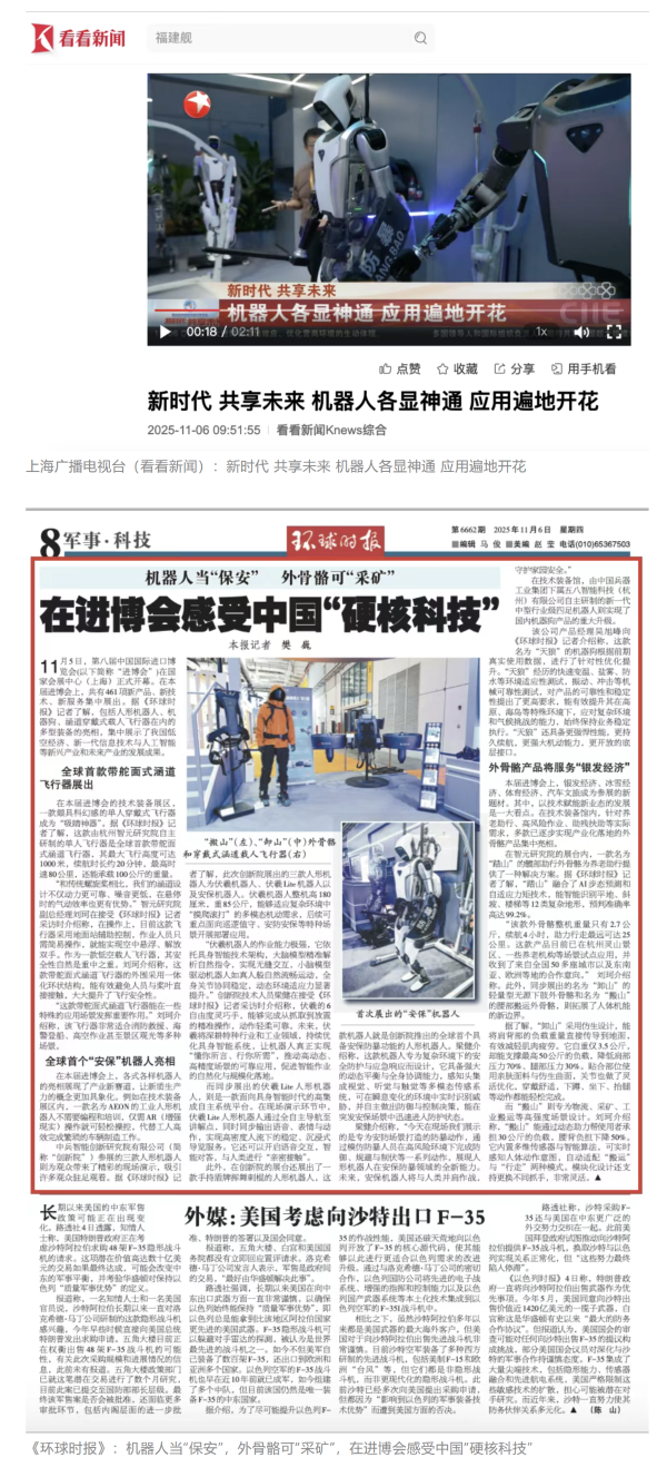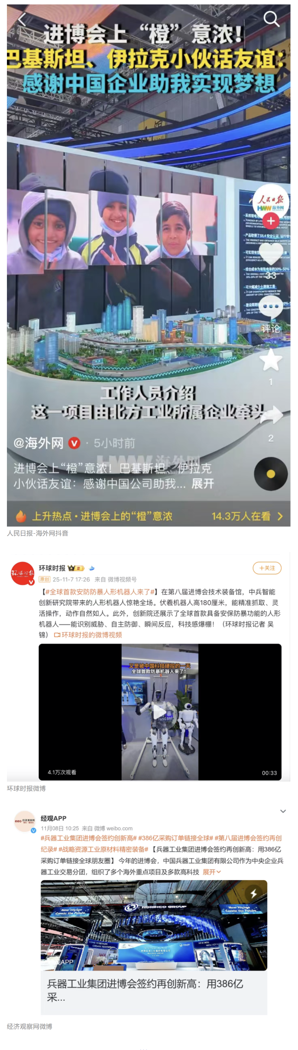 11月5日至10日,中國兵器工業(yè)集團(tuán)有限公司組團(tuán)參加第八屆中國國際進(jìn)口博覽會(huì)。集團(tuán)公司以“堅(jiān)持合作共贏,推進(jìn)高水平對(duì)外開放,助力構(gòu)建新發(fā)展格局”為目標(biāo),圍繞“新征程,共創(chuàng)未來”主題組團(tuán)參展,集中展示了一系列新技術(shù)、新理念、新成果,取得豐碩成果,受到廣泛關(guān)注。 嘉賓云集 本屆進(jìn)博會(huì)上,蒙古國駐華大使、贊比亞礦業(yè)和礦產(chǎn)開發(fā)部常任秘書、津巴布韋首席司長等多國政要蒞臨集團(tuán)公司組展展區(qū),了解有關(guān)項(xiàng)目情況。 國家能源集團(tuán)、東風(fēng)汽車、哈電集團(tuán)、鞍鋼集團(tuán)、中鋁集團(tuán)、通用技術(shù)集團(tuán)、中國中車、中國長安汽車、中國電建等央企領(lǐng)導(dǎo),工信部、國務(wù)院國資委、中國貿(mào)促會(huì)、陜西省、上海市、浙江省等國內(nèi)政府部門領(lǐng)導(dǎo)以及國內(nèi)外合作伙伴蒞臨集團(tuán)公司組展展區(qū)參觀指導(dǎo)。對(duì)集團(tuán)公司高質(zhì)量共建“一帶一路”,與各國合作伙伴共享發(fā)展機(jī)遇、實(shí)現(xiàn)互利共贏給予高度評(píng)價(jià)。 媒體關(guān)注 集團(tuán)公司集中簽約亮相央視綜合頻道《新聞聯(lián)播》、央視新聞?lì)l道《朝聞天下》《新聞30分》《共同關(guān)注》、央視財(cái)經(jīng)頻道《正點(diǎn)財(cái)經(jīng)》《經(jīng)濟(jì)信息聯(lián)播》。 《環(huán)球時(shí)報(bào)》、環(huán)球網(wǎng)、《新京報(bào)》、《中國旅游報(bào)》等對(duì)集團(tuán)公司人形機(jī)器人、四足機(jī)器人、涵道穿戴式載人飛行器、外骨骼等多型新域新質(zhì)產(chǎn)品,集中亮相進(jìn)行報(bào)道。新華社、央廣中國之聲、新京報(bào)(貝殼財(cái)經(jīng))、上海廣播電視臺(tái)等媒體直播探館,打卡兵器“硬核科技”。 人民日?qǐng)?bào)客戶端、新華社客戶端、人民網(wǎng)、中國網(wǎng)、中國日?qǐng)?bào)網(wǎng)、國務(wù)院國資委網(wǎng)站、國資小新微信公眾號(hào)、國資小新Facebook、學(xué)習(xí)強(qiáng)國中央企業(yè)學(xué)習(xí)平臺(tái)、經(jīng)濟(jì)觀察網(wǎng)、新京報(bào)客戶端等第一時(shí)間刊發(fā)集團(tuán)公司組展簽約、ESG建設(shè)等情況。新浪財(cái)經(jīng)、界面新聞等商業(yè)平臺(tái)閱讀量累計(jì)超500萬次。 在微博、抖音等新媒體平臺(tái)上,集團(tuán)公司高科技產(chǎn)品演示、5D穹幕電影體驗(yàn)等短視頻持續(xù)引爆流量,累計(jì)播放量超800萬次,點(diǎn)贊量破50萬?!氨鞴I(yè)集團(tuán)進(jìn)博會(huì)簽約386億”相關(guān)話題登上微博熱搜榜,閱讀量破5000萬次。 文字丨劉暢 |